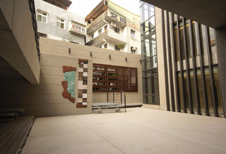 基地位於校園的舊有入口處,面對沿著莊敬樓與自強樓與操場之間,有著一條種植著黑板樹的昔日入口林蔭道;校內與明志路有著進3公尺的高程差。面對這樣的條件,我們以設計一處半開放的挑空中庭來處理,作為學校數位學習及社團活動的廣場空間,試圖創造出一個有趣的空間層次。
