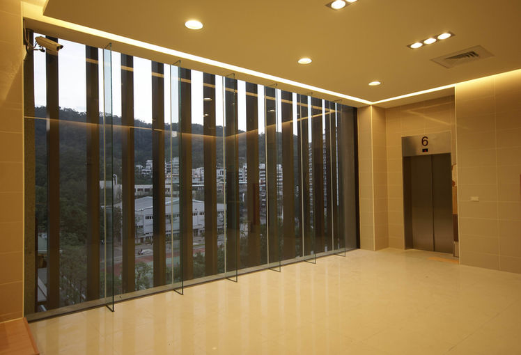 校史室、演講廳配置在5樓及6樓平面的西北角側,這樣可以利用基地的條件,俯瞰整個校園開放空間。並以校史空間展示廊及入口交誼空間,分別讓校史室及演講廳的室內空間與校園開放空間有所對話。