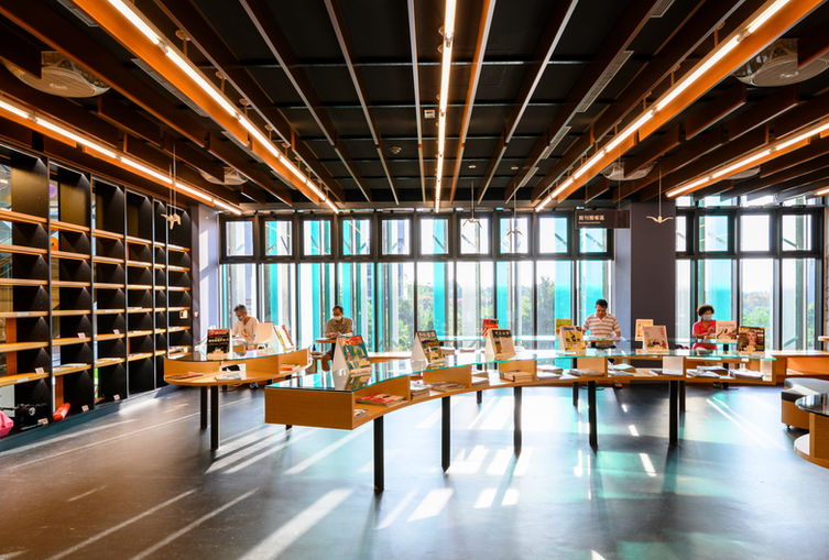 圖書館設於南面,以蘆葦般的PC格柵,扮著光影、綠樹和微風,和社區輕輕絮語。以兼具都市防災的廣場空間面對埤塘:廣場於基地街角面面對11號埤塘的位置,散步於埤塘周邊的居民、和基地圖書館的學子、集會所、兒童及老人們,有了共同的空間連結。